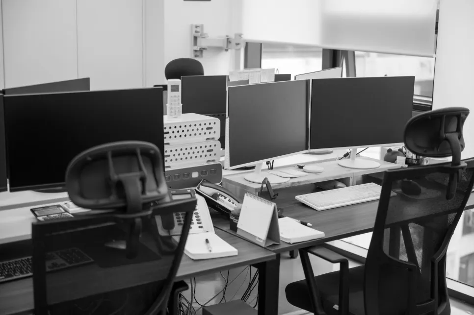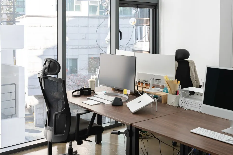 실무진 사무실에는 널찍한 책상, 듀얼모니터, 풍부한 간식거리, 공기청정기가 비치 되어 있어요.